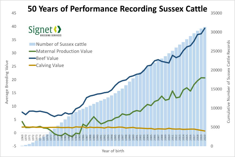 For more information about the Sussex recording programme and to view Estimated Breeding Values for Sussex cattle go to www.signetdata.com  Video clips explaining how breeders can use the service can be accessed here https://www.signetdata.com/technical/herdbook-services/sussex-cattle/